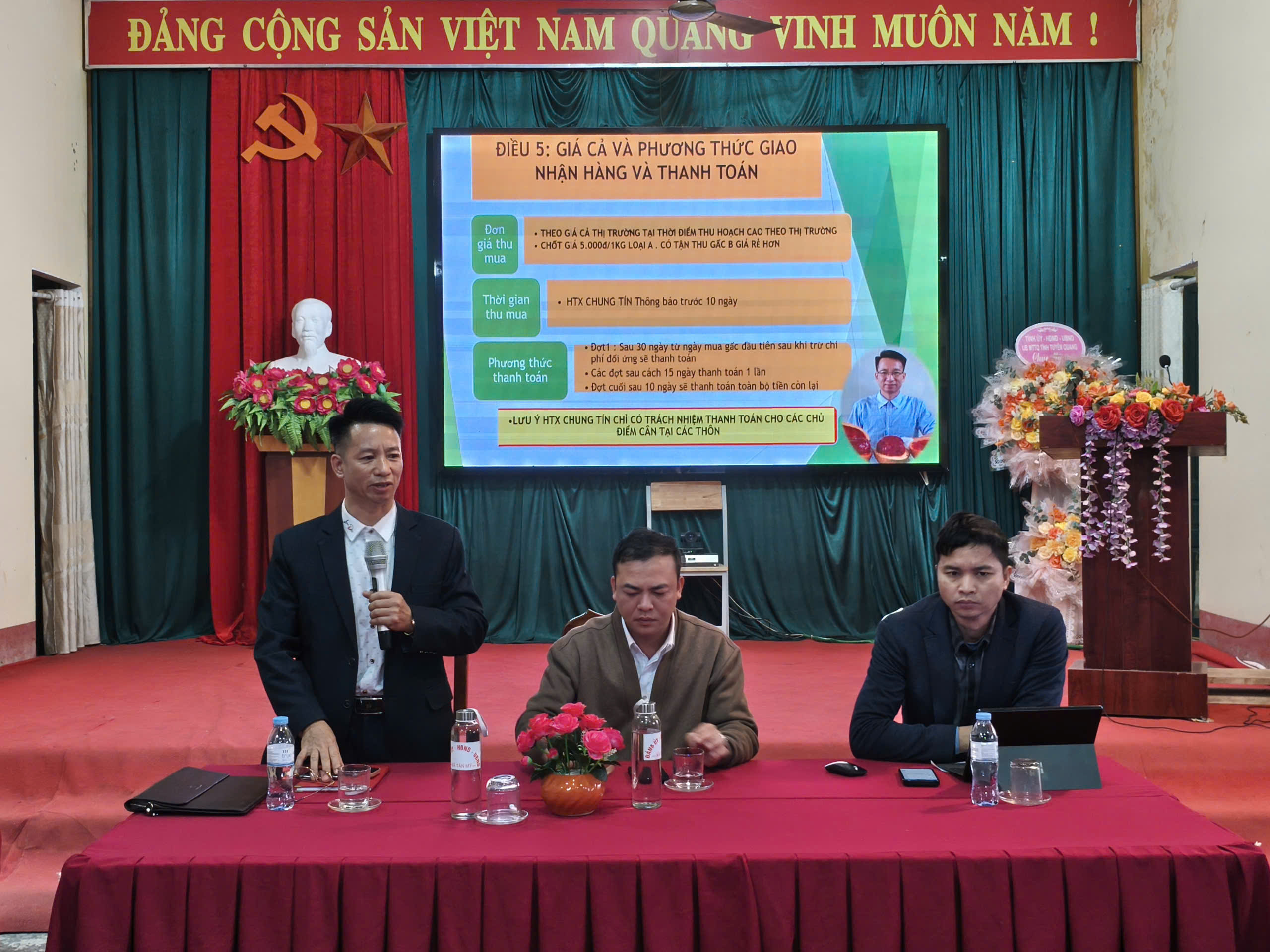 Dự hội nghị có Đồng chí Hoàng Trần Trung, Bí thư Đảng ủy xã; đồng chí Hoàng Mạnh Hùng, Phó Bí thư Đảng ủy, Chủ tịch UBND xã; đồng chí Ma Doãn Đức, Ủy viên BCH Đảng bộ, Phó Chủ tịch UBND xã; Lãnh đạo Phòng Kinh tế, các đồng chí bí thư chi bộ, trưởng thôn và đông đảo bà con nhân dân trên địa bàn xã. Đặc biệt, có sự tham gia của ông Đoàn Văn Chung, Chủ nhiệm Hợp tác xã Chung Tín.