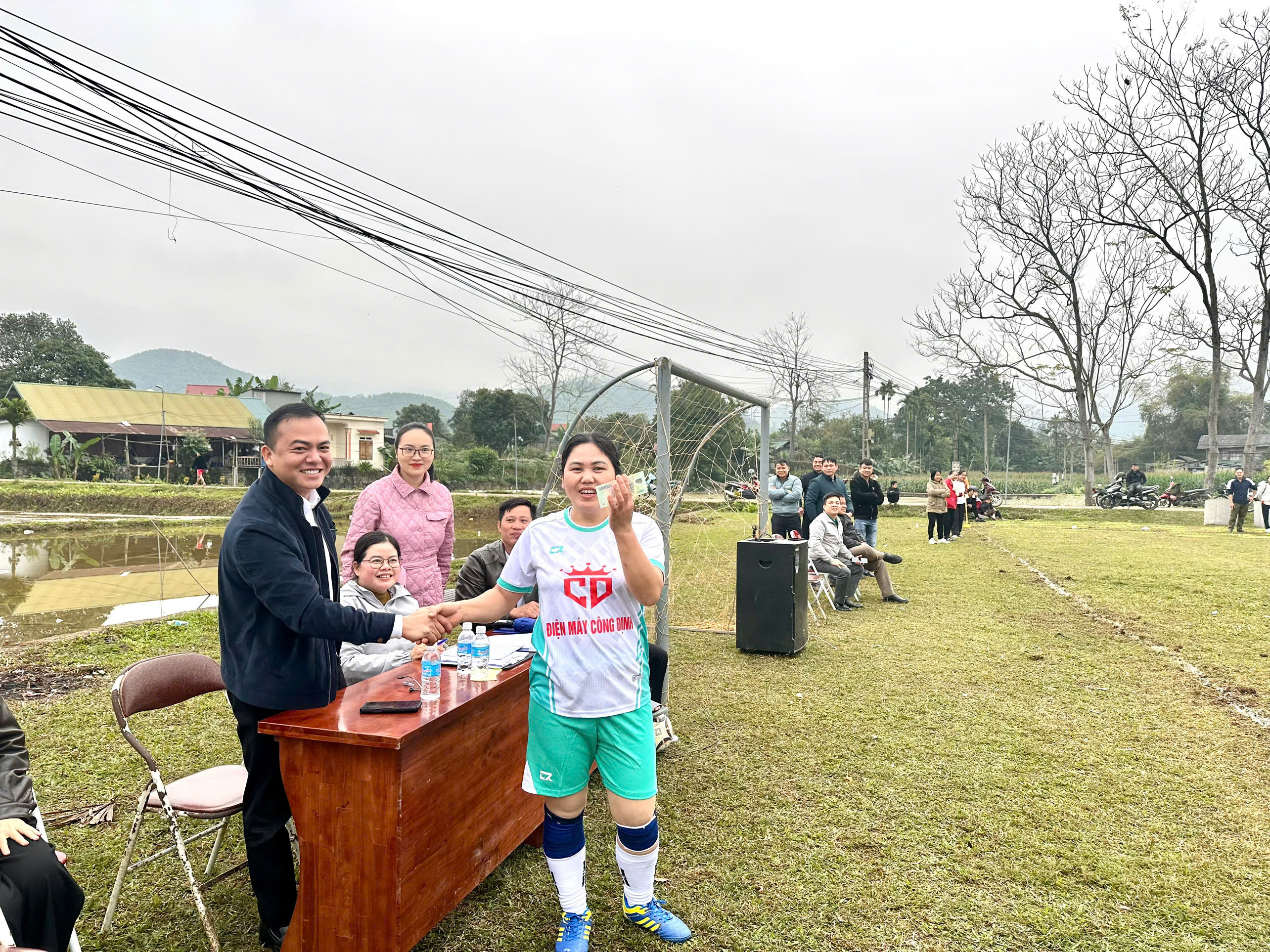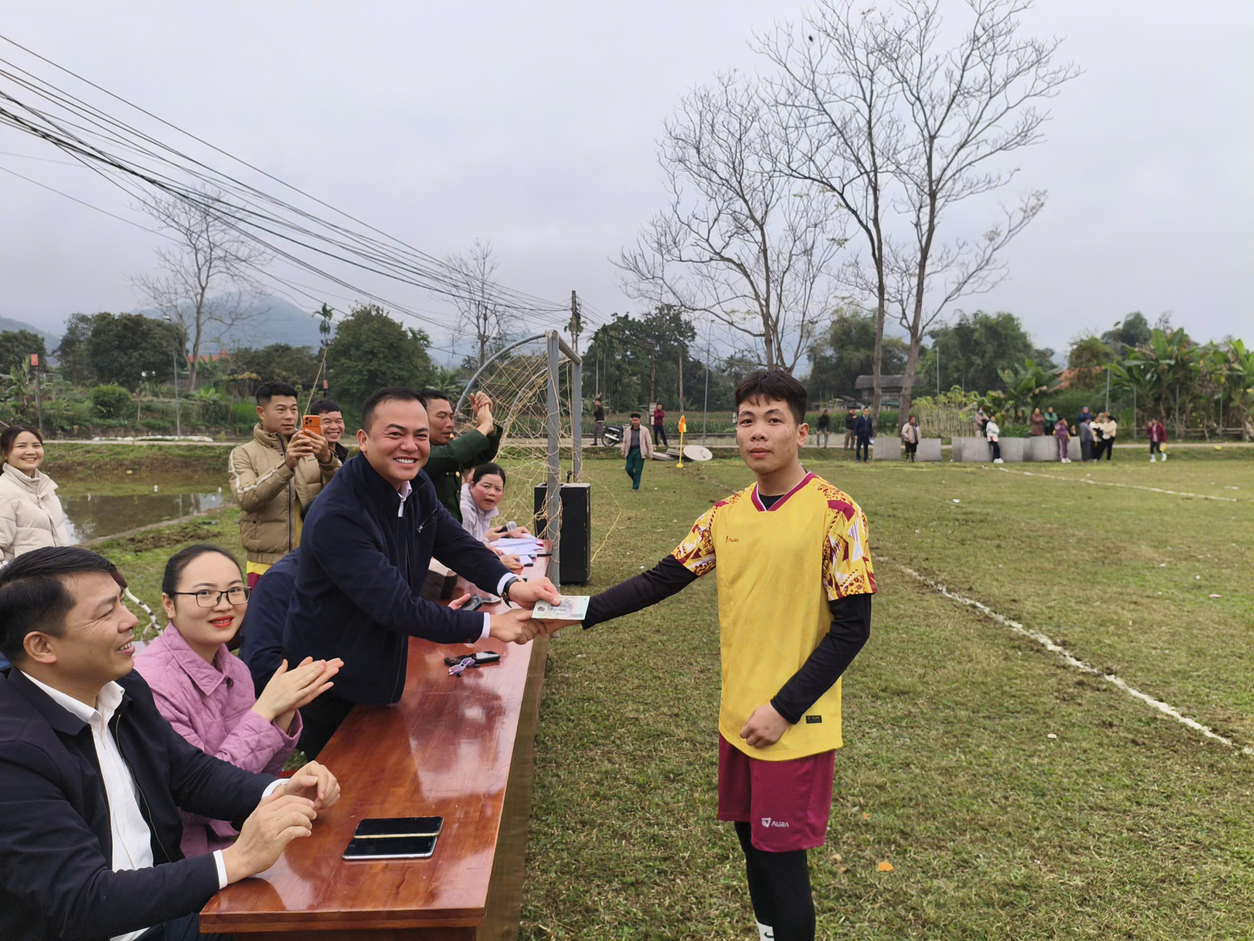 Đồng chí Hoàng Trần Trung, Bí thư Đảng ủy xã trao thưởng cho những bàn thắng đầu tiên tại giải