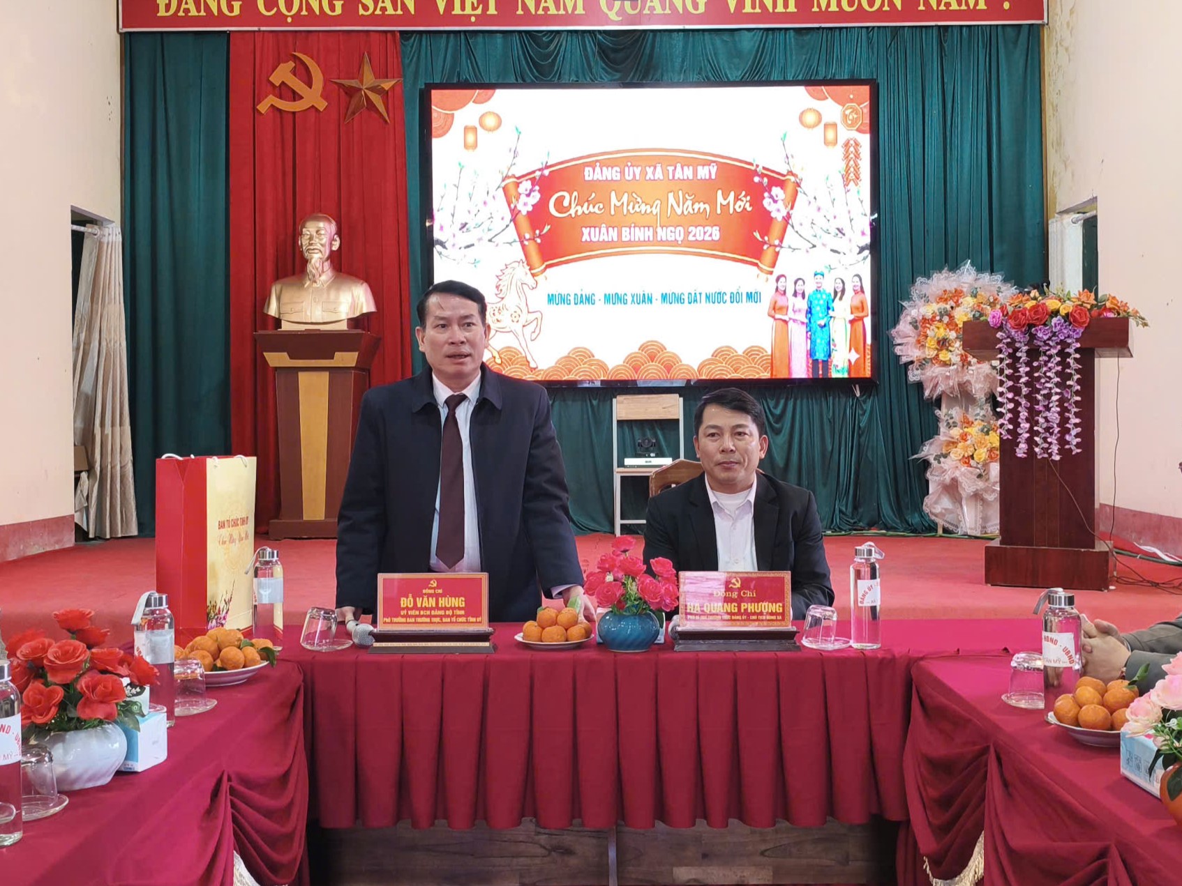 Tại buổi gặp mặt, đồng chí Đỗ Văn Hùng đã thay mặt lãnh đạo Tỉnh ủy gửi lời chúc mừng năm mới sức khỏe, hạnh phúc và an khang đến toàn thể cán bộ, Đảng viên và nhân dân xã Tân Mỹ. Đồng thời, đồng chí Phó trưởng Ban Thường trực Ban Tổ chức Tỉnh ủy yêu cầu Đảng uỷ xã Tân Mỹ thực hiện tốt một số nội dung trọng tâm trước, trong và sau tết Nguyên Đán; trong đó tập trung chú trọng việc chăm lo tết cho hộ gia đình nghèo, hộ gia đình chính sách; công tác đảm bảo an ninh trật tự, an toàn giao thông, phòng chống cháy nổ dịp tết, công tác chuẩn bị bầu cử Đại biểu Quốc hội và HĐND các cấp đảm bảo đúng theo quy định của Luật...