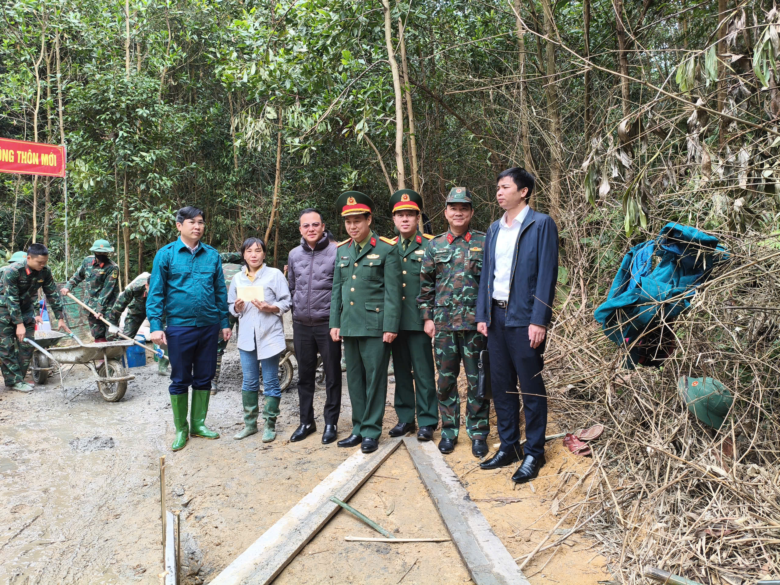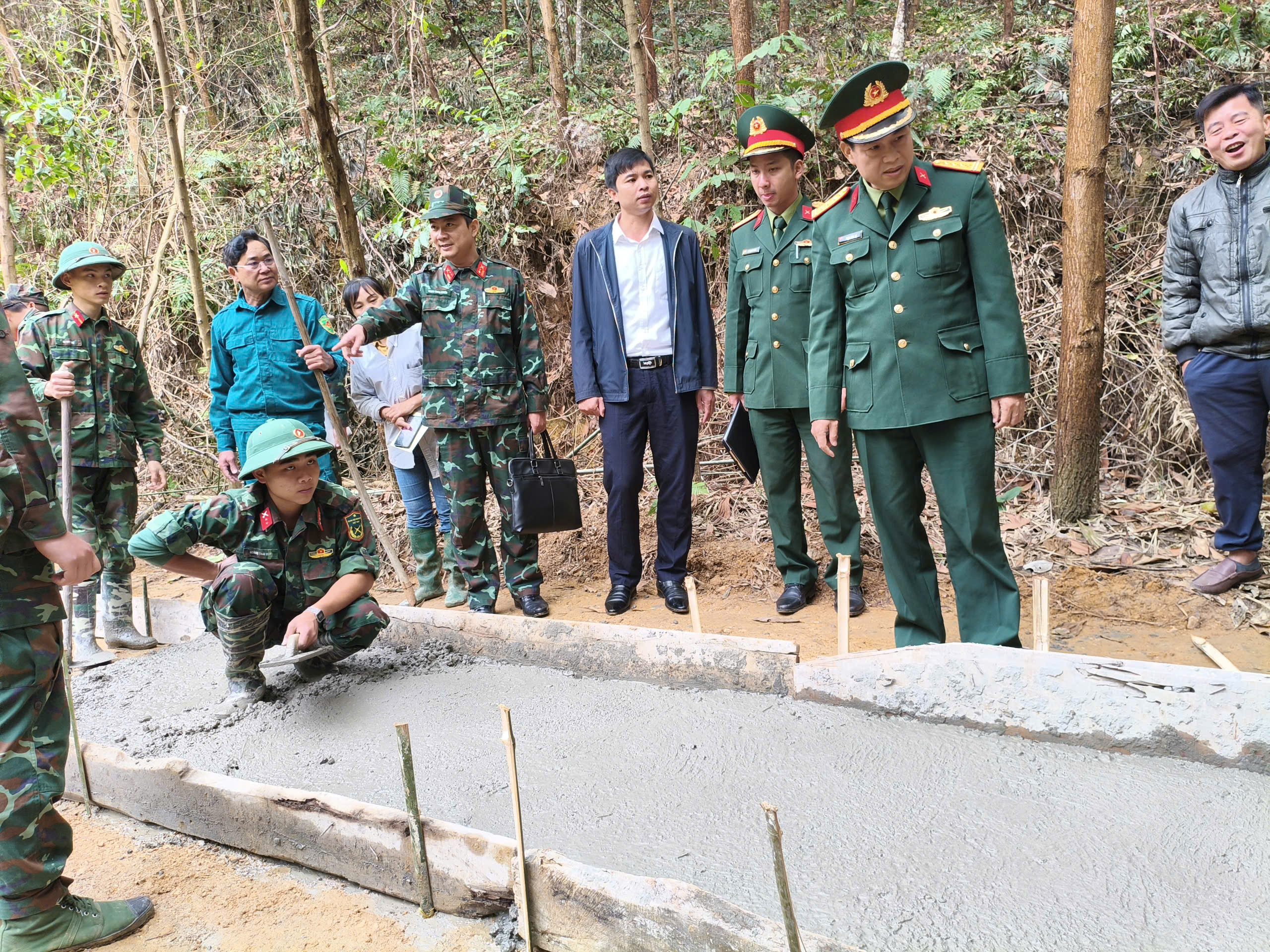 Kiểm tra công tác hỗ trợ làm đường bê tông của các chiến sỹ