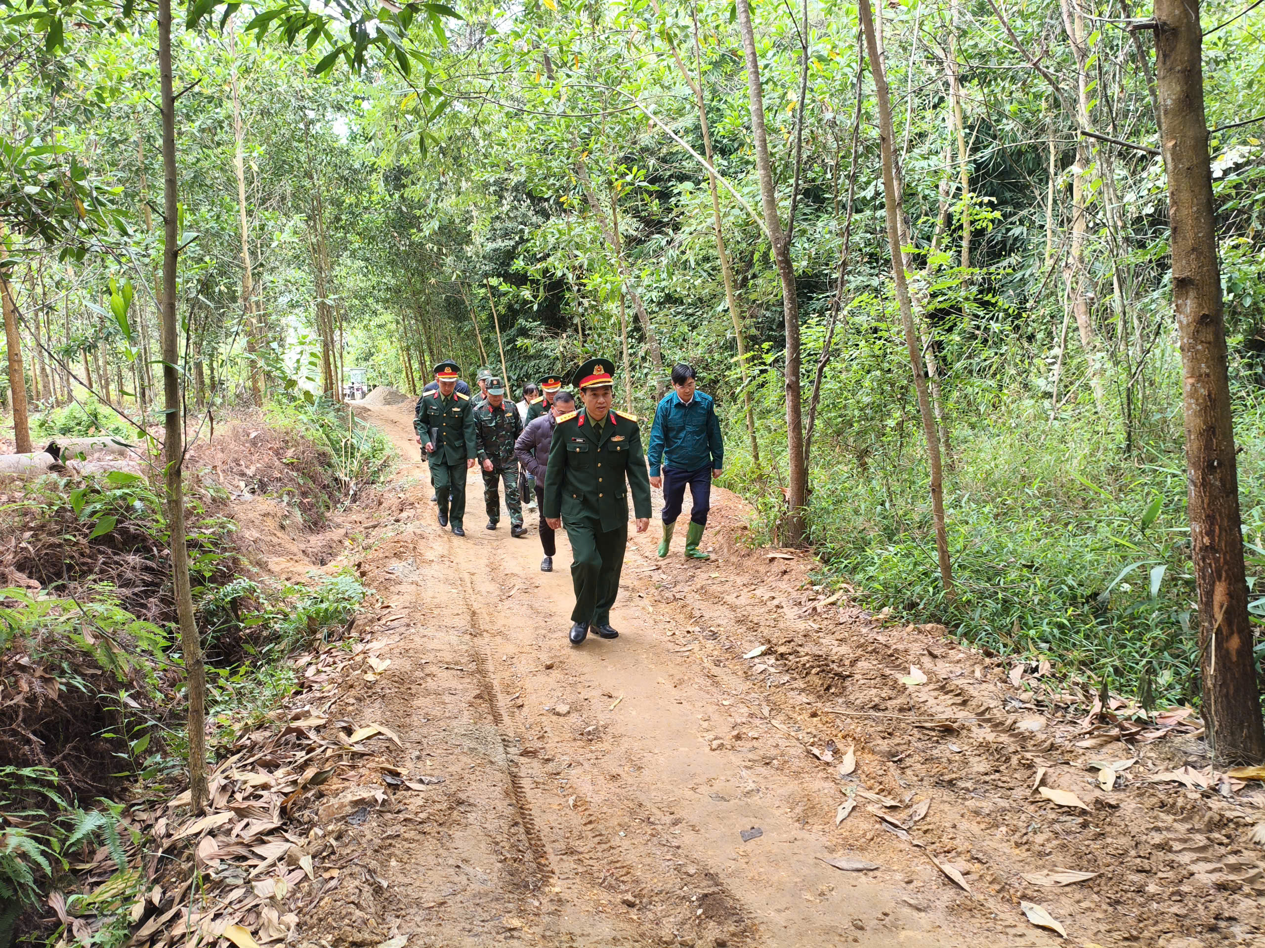 Các đồng chí lãnh đạo trong đoàn đến thăm nơi các chiến sỹ đang hỗ trợ người dân