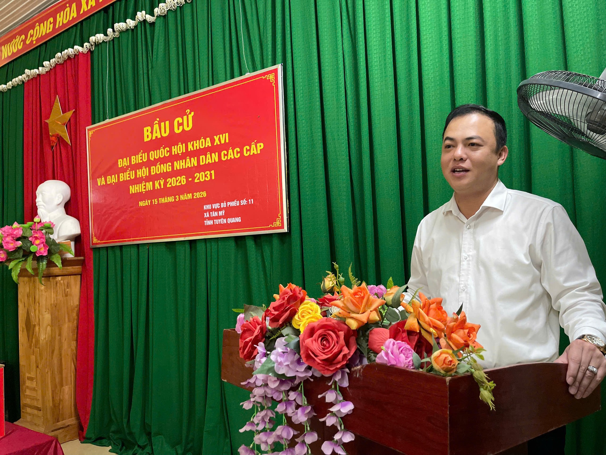 Đồng chí Hoàng Trần Trung, Bí thư Đảng ủy xã phát biểu tại lẽ khai mạc bầu cử tại thôn Khuôn Thẳm