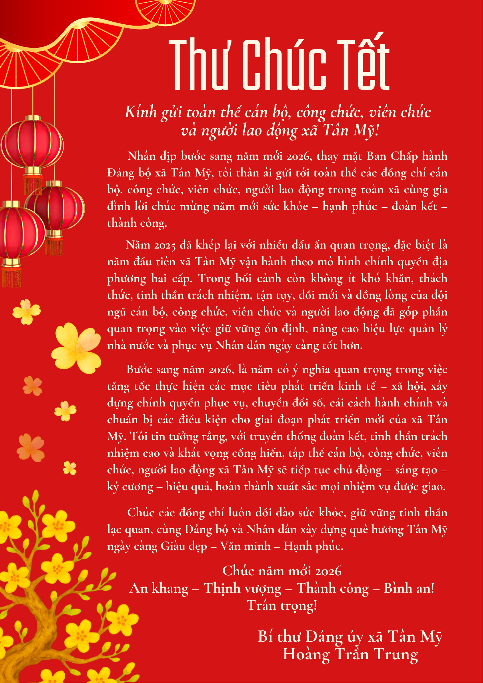 THƯ CHÚC MỪNG NĂM MỚI 2026 CỦA BÍ THƯ ĐẢNG ỦY XÃ TÂN MỸ